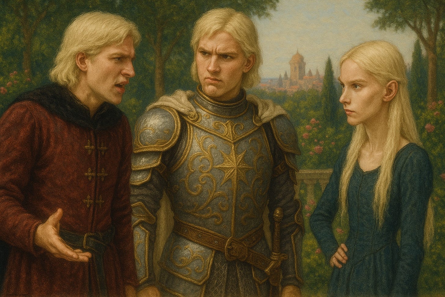Then at the trial Larra weeps as the Rogare bros are punished—no doubt in part because Aegon and Viserys know perfectly well they were involved in some kind of shady bullshit—but they’re subsequently let go because at this point their faction is a hollow threat while Larra is starting to withhold puss and cry 24/7 so as to groom her child-hubby into shielding her kin (remember this is exactly what Marg does to Tommen in GoT). This is a problem Aegon would rather just make go away for Viserys given A) the entire conspiracy is still plausibly deniable; B) he trusts his little bro implicitly and knows he’d never participate in some weird gay foreign Jew conspiracy to murder him and steal the throne.