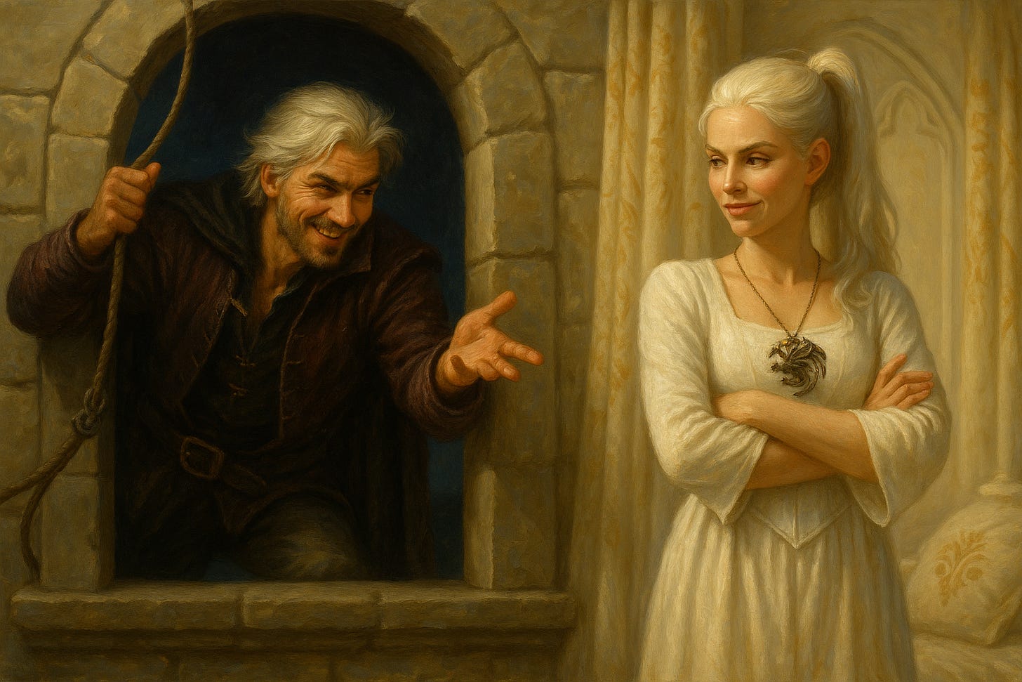 Methinks after the debacle with Jeyne our protagonist did a bit of soul searching—about Falena. Cassella. Aemon. Naerys. Viserys.