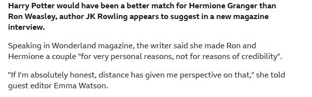 And for good fucking reason—because it turns out JKR was lowkey full of shit that whole time she was gaslighting Harry/Hermione niggas and protesting just a bit too much that it was ackshully Ron was her Twue Wuv, because not too long ago she put that whole Dumbledore is Gay retcon to shame by formally acknowledging to the world that Harry and Hermione would have been a better match.