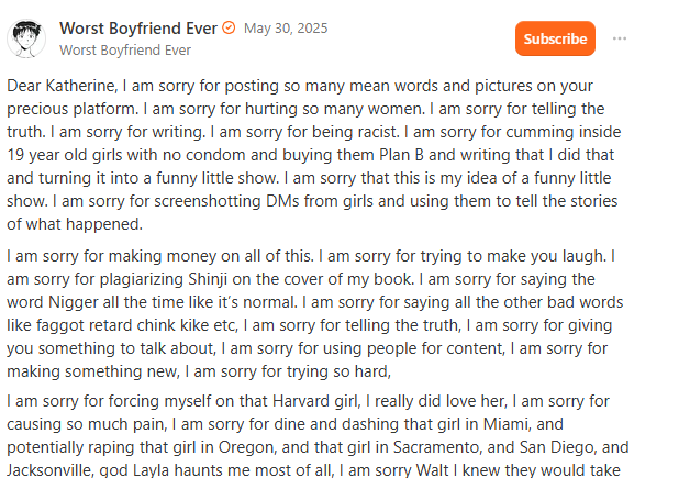 …which he’d no doubt write off as ironic or whatever, but Layla pretty clearly wasn’t positively disposed towards him when she briefly returned to Substack last summer, and I’ve also heard shit from her friends about what happened that I’m not at all sure is true but continues to fill my nostrils with a pretty fucking rancid stench tbh fam.