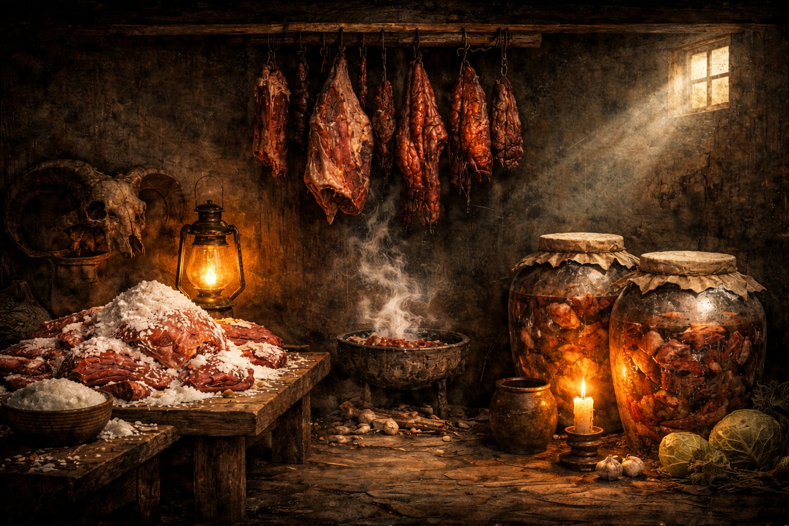 Salting is the hard answer. Like a road in winter you entomb the cut surface in heaps of crystalline sodium chloride, which instantly dissolve into a dense brine that forces its way into every fiber until osmotic pressure takes control. Water is hauled first out of stray bacteria cells and then the muscle itself, until under a microscope the field’s all shrunken shapes with walls warped inward—in layman’s terms, a killing ground: hypertonic, unforgiving, and statistically lethal to anything that wanders in uninvited. Proteins contract and lock up; the flesh grows firm; almost stubborn. Flavor sharpens, picking up a certain gaminess with hints of copper. This is preservation by dominance, simple and intractable; you don’t bargain with rot, just deluge the landscape with such overwhelming force that everything else breaks against it. The meat holds its shape for years if you do it right. Nothing can grow there; nothing gets close.