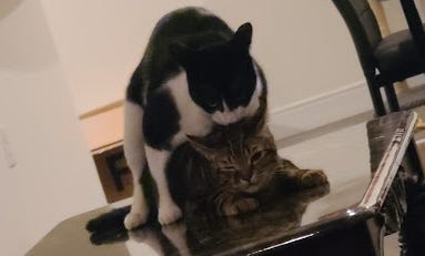 At times quite literally—he often enjoys physically mounting his baby bro Cricket (who is ackshully several months his senior but also considerably smaller than him physically) as if he’s attempting to ram his dick up Cricket’s asshole, which doesn’t make much sense given that the two of them are castrated… but I suppose if someone removed mine own penis I might also be prone to such behavior come to think of it.