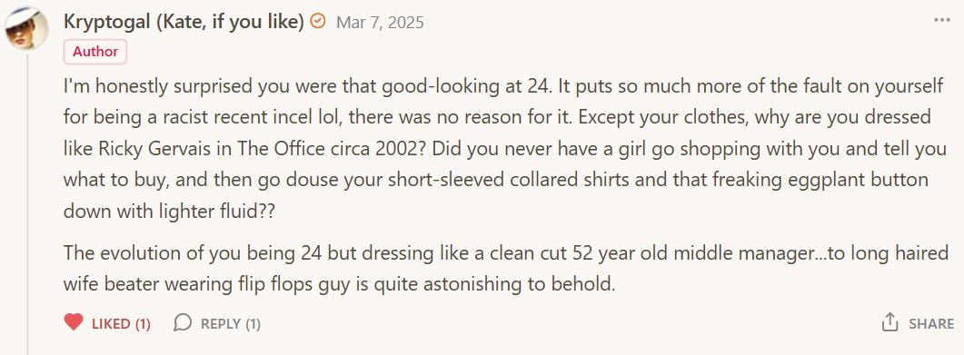 Attributing inceldom / sexual failure generally to moral error on the man’s part, which seems to be borne of a precognitive reattribution of womanly disgust to behavioral noncompliance which then backsolves for a moralistic poopoopeepee reason a man was rejected. And I hate picking on Kryptogal (Kate, if you like) again as I really don’t want her to take another hiatus but I think she knows I only do it because we’re archetypally salient metadiscursive rivals and so: