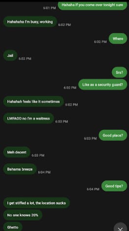 But in spite of that and all the racist shit I was actually quite chivalrous with Ruby all considered—the lass was a horrid negotiator, see, and I likely could have had her on the reg for maybe $150 a pop had I really pushed it. But I ackshully kind of did want to help her out with that Miami shit so she wouldn’t need to go fuck some Boomer.