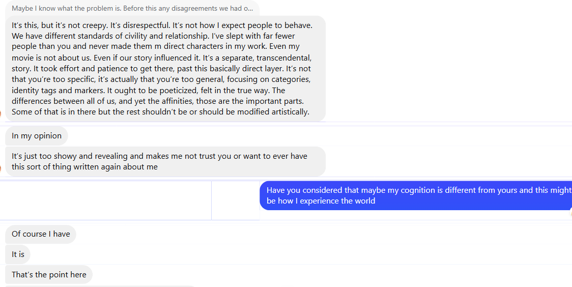 At the same time, writers are often unusually sensitive to the judgments of others given that their actual work is explicitly subjected to evaluation such that regardless of public posture writers are eternally working off of that critique. This creates a strange duality: easy confidence in their interpretive authority combined with inward fragility about how they are seen. Given the overlap in attendant cognitive styles this naturally bleeds into relationships and germinates both a persistent fixation on interpretive sovereignty and oversensitivity to criticism.